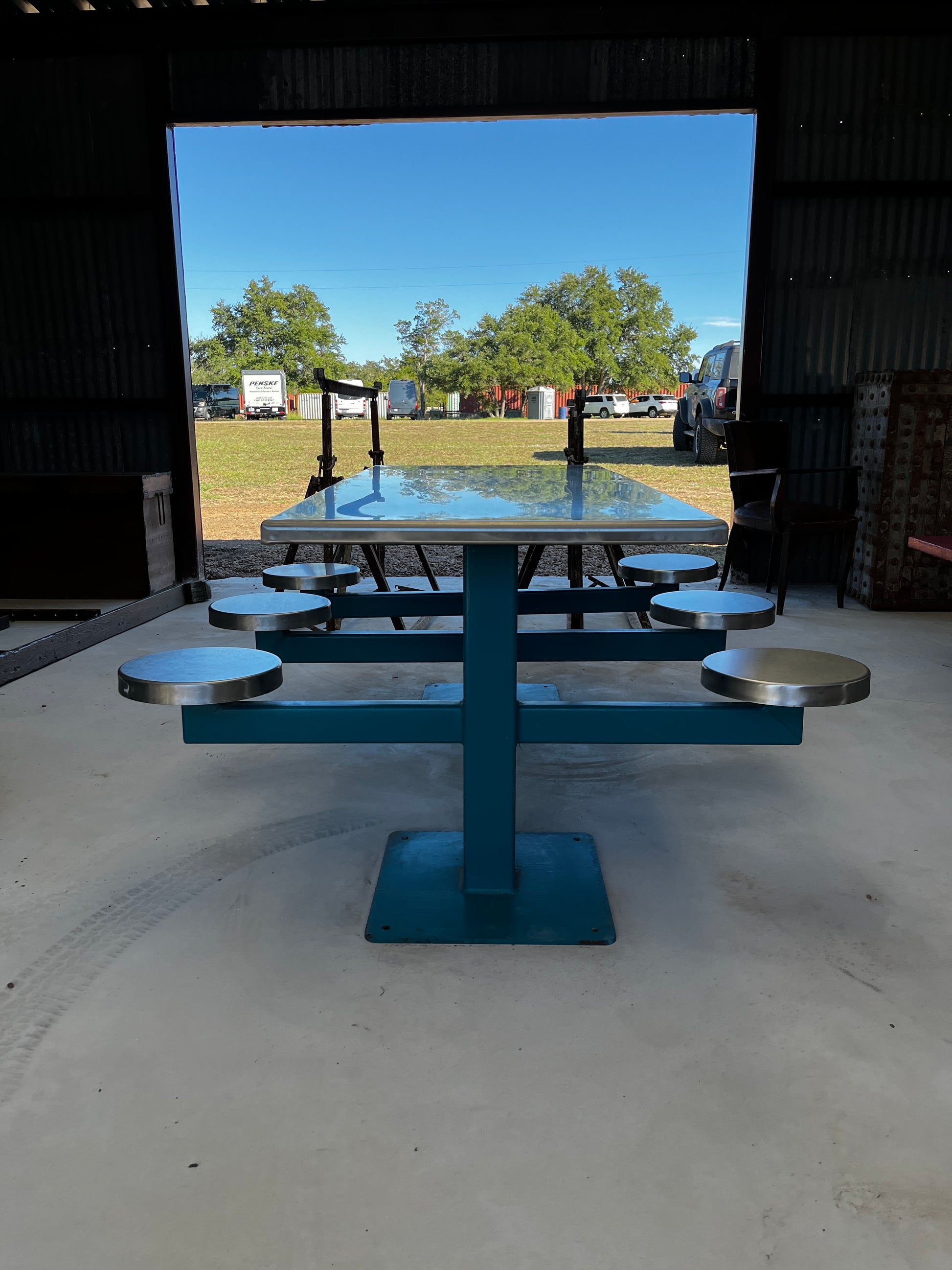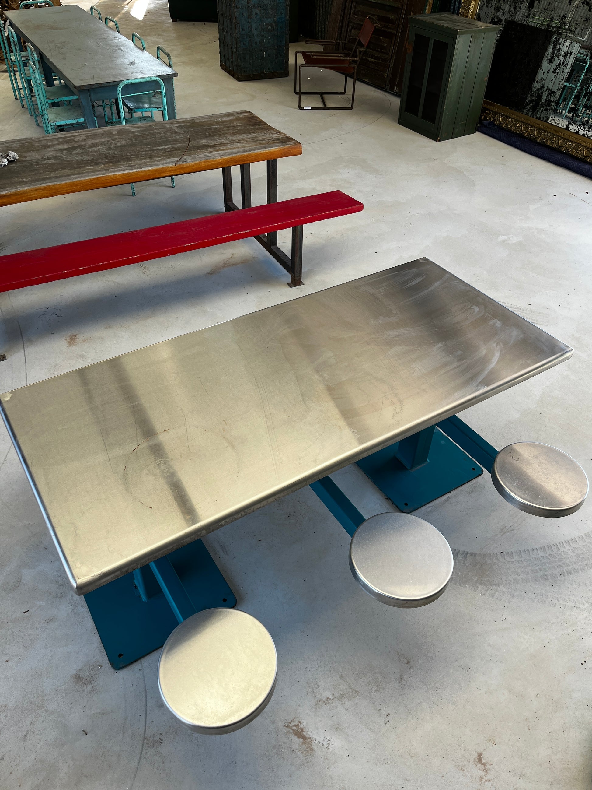Stainless steel tops and seats, painted steel frame